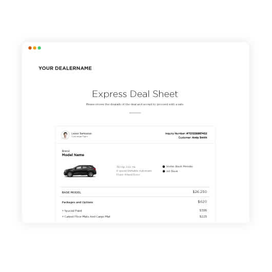 To complete the purchase online, customers will review and accept the final deal sheet with numbers based on their approved credit. Backend tools are available for your sales team to make any necessary adjustments to the vehicle based on availability, pricing, applicable discounts and rebates.