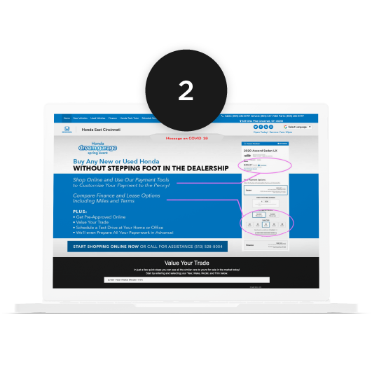 Remind your customers that they can shop your inventory and complete the transaction without leaving their home. Highlight any unique offers you have such as remote test drives, home delivery, service pickup/dropoff, online trade valuations, etc.