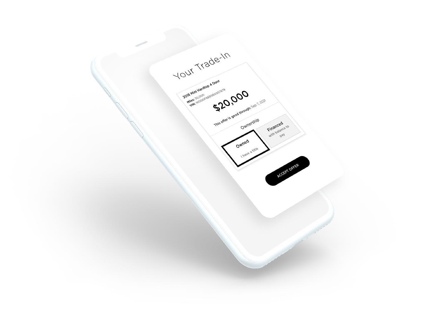 Roadster’s proprietary trade tool enables customers to use mobile-friendly technology to easily capture and submit their trade-in information to you. It gives you complete control over the value of the vehicle, and streamlines the process so you can make your customer a firm offer in minutes.