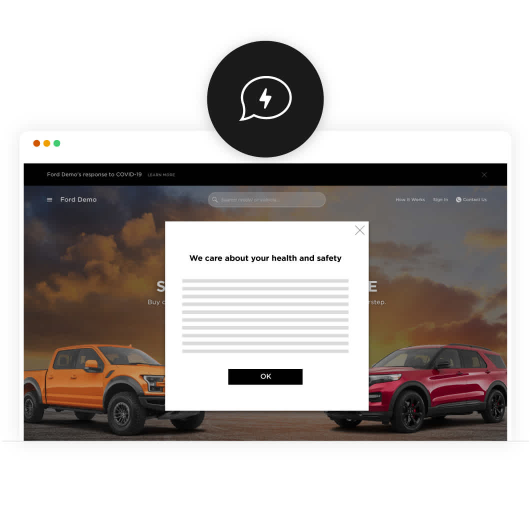 Let your online customers know about your “contactless car buying” option available during the COVID-19 threat. We can provide you with an Alert Banner and Overlay Message featuring messaging that is personalized to your dealership. Contact your Success Manager or email dealersupport@roadster.com to enable this feature.