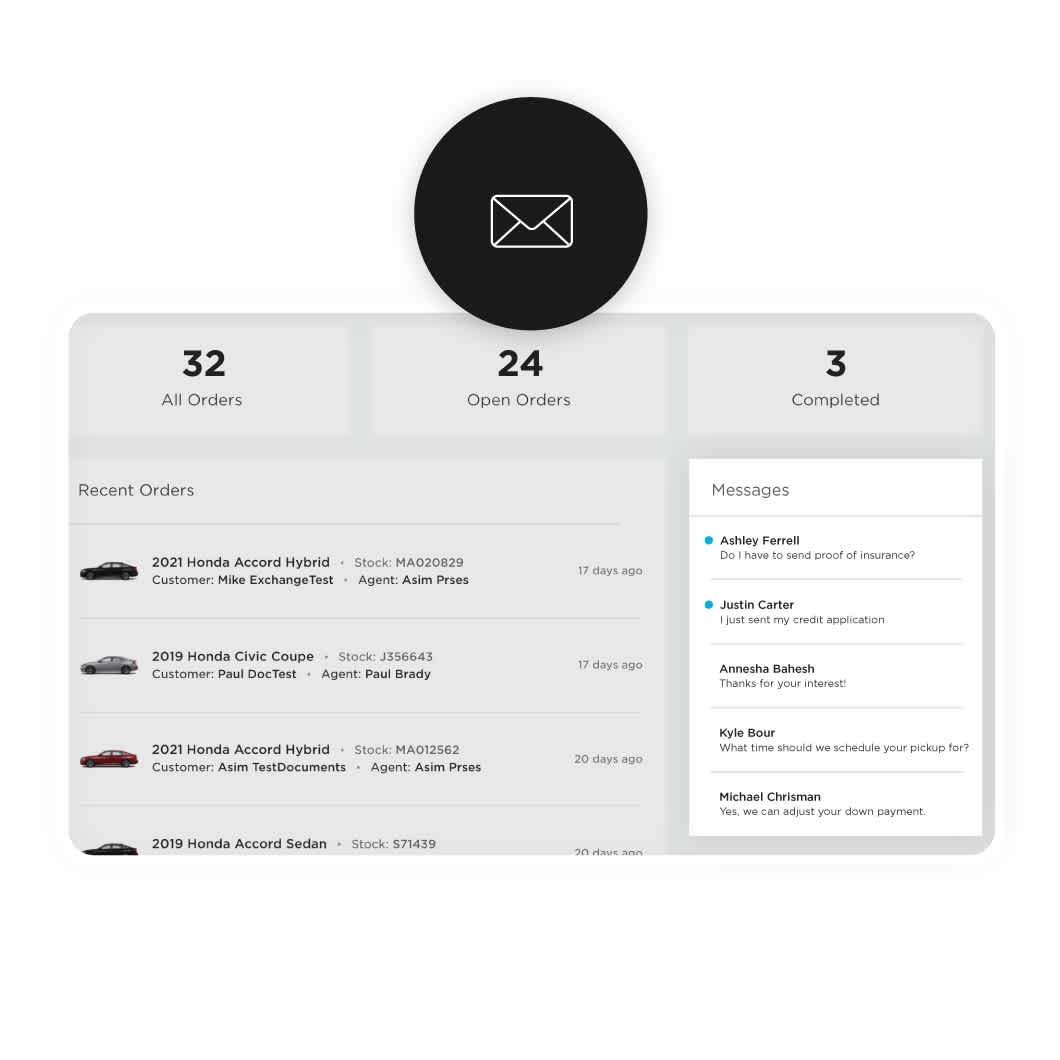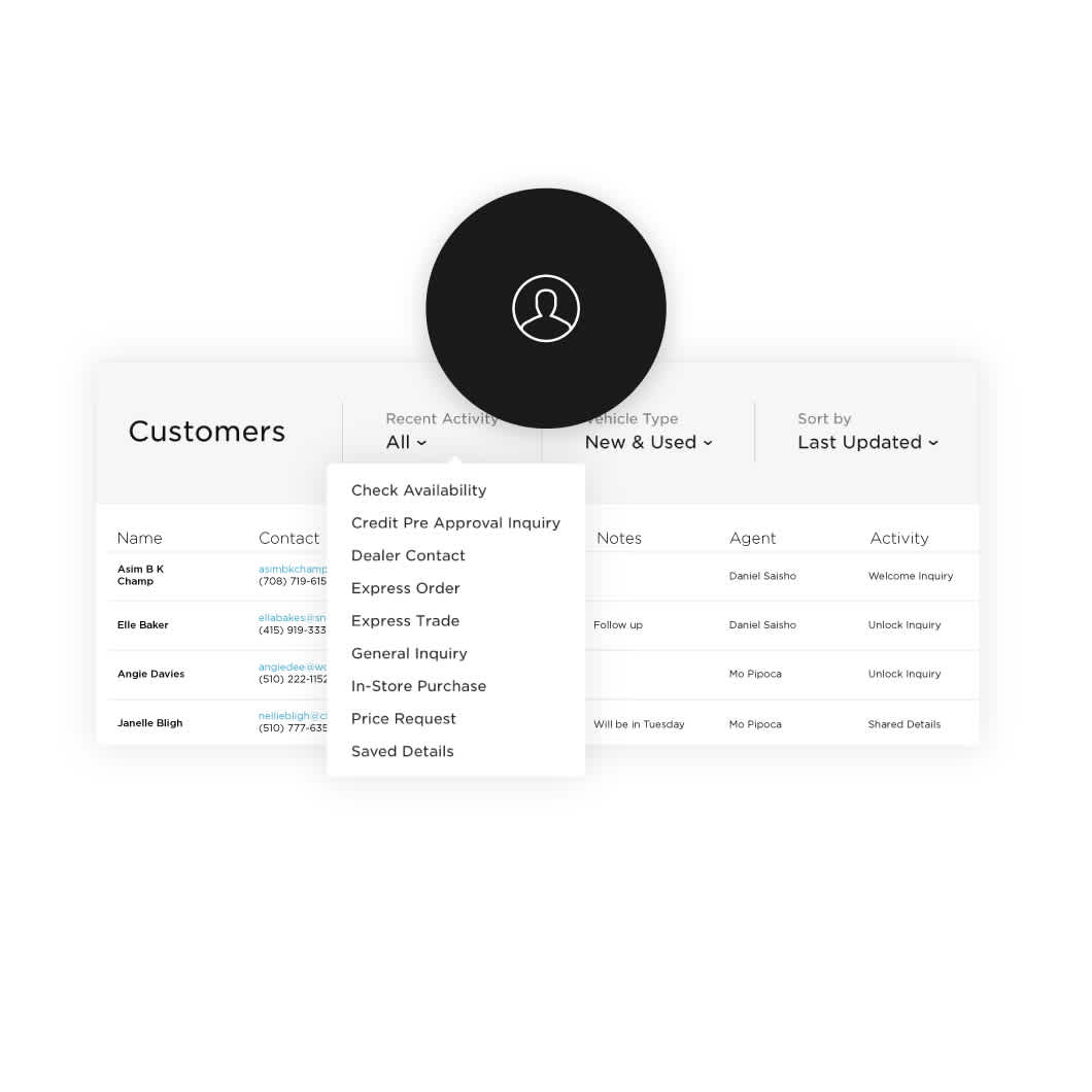 All of the customer’s online and in-store activity will be organized in one aggregated view under the “Activity” section: leads, orders, saved deals with terms, trade-ins and add-ons. Sales agents can see who initiated the activity and any next steps they need to take (displayed as links on the page).