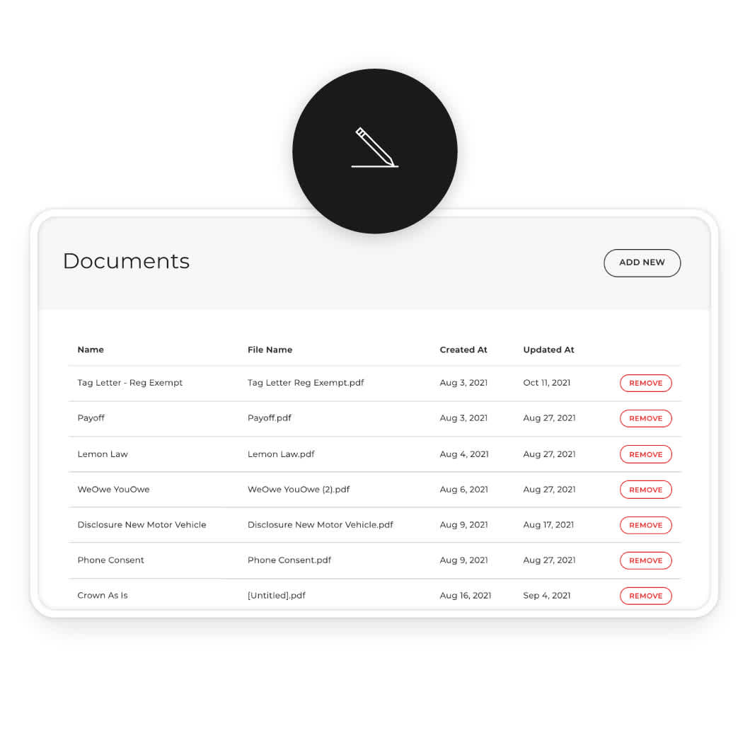 Save time (and trees) with every transaction. Our new Documents workflow within Roadster Admin enables you to digitize common sales documents, rather than print them each time, and streamlines the signing process. After you upload the documents once, agents can access them any time within a Documents page and customize them in under a minute to support different deal types. If the customer’s already submitted their information via your Express Store, it will auto-populate in the documents.