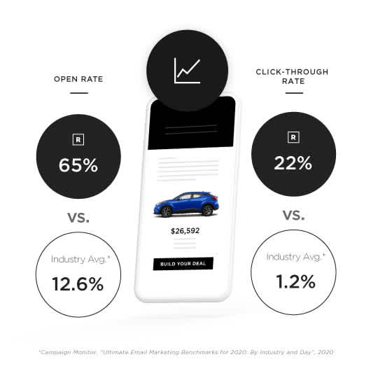 Roadster’s newest product instantly replies to customer queries with quality, actionable emails containing the price and VIN information from your Express Store. With the information they want right at their fingertips, customers are invited to immediately begin building their deal online. And they do. Express Response emails generate 10x more engagement than generic CRM autoresponders.